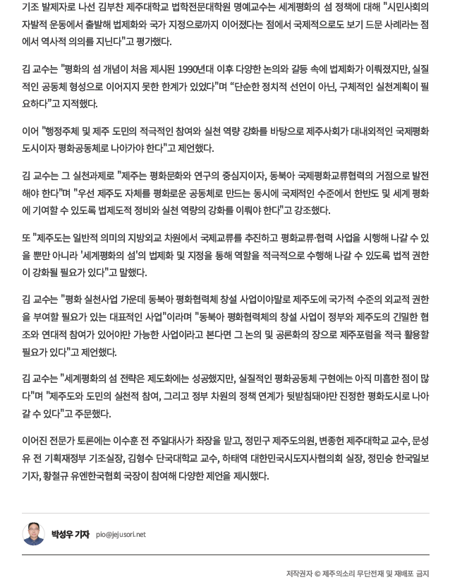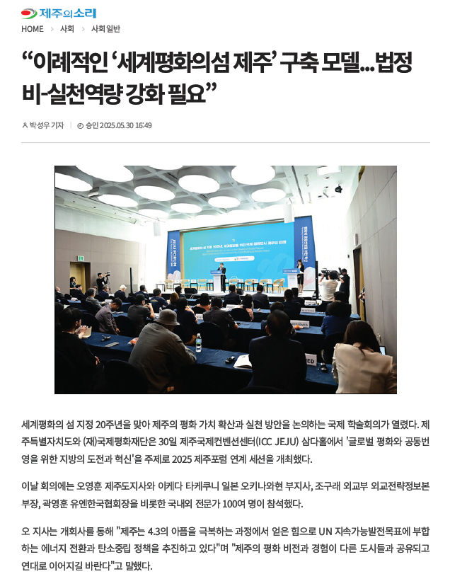 기사 원문보기(출처): "이례적인 '세계평화의섬 제주' 구축 모델...법정비-실천역량 강화 필요": 제주의소리(https://www.jejusori.net/)