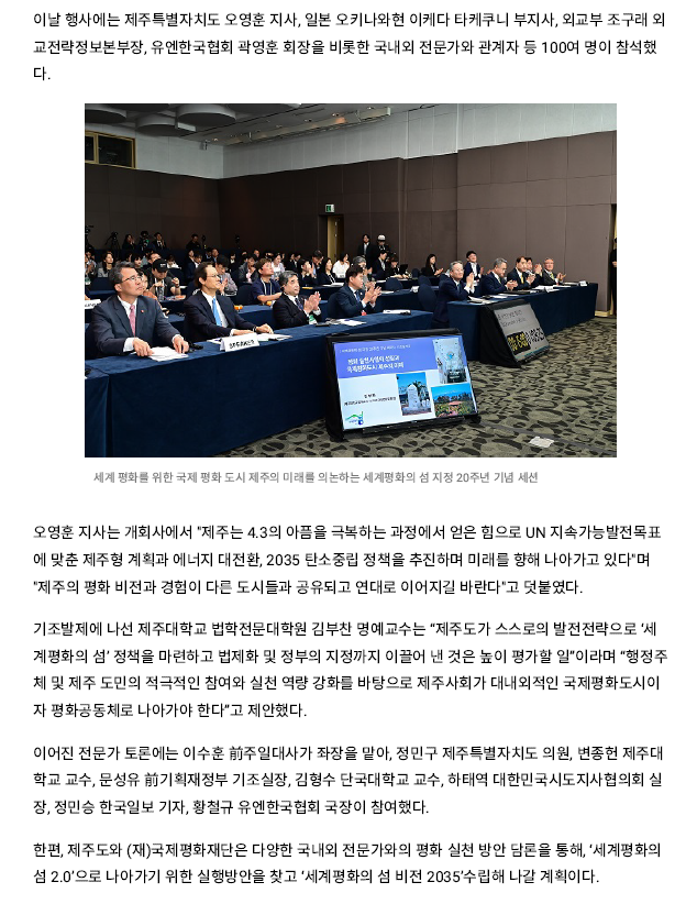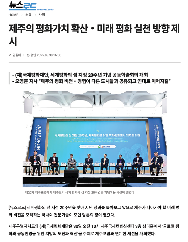 기사 원문보기(출처):제주의 평화가치 확산‧미래 평화 실천 방향 제시: 뉴스로드(https://www.newsroad.co.kr/)